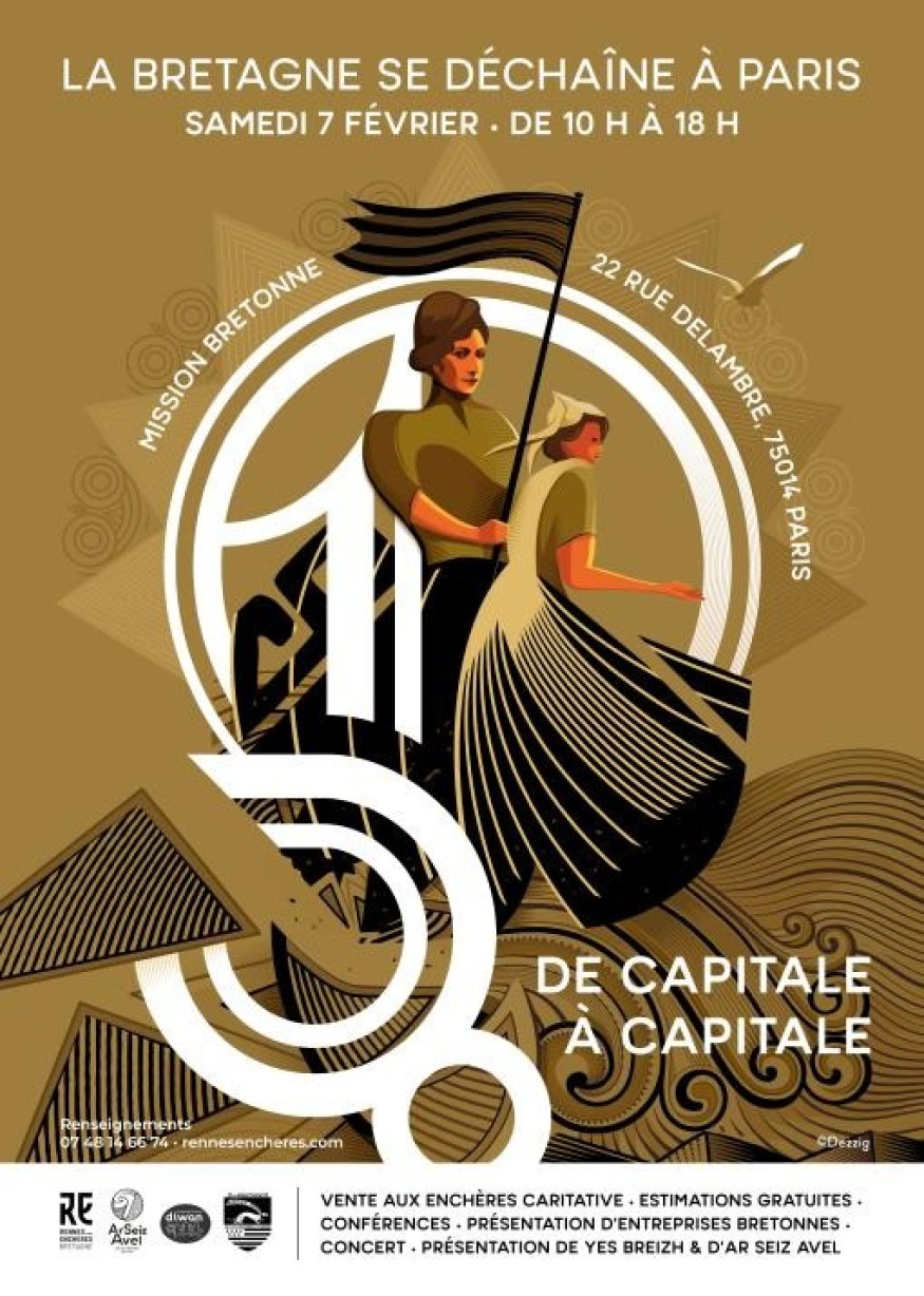 À la Mission bretonne, à Paris, une journée de rencontres et d’animations (estimations gratuites, expo Ar Seiz Avel, dédicaces, conférences, concert) précédera, samedi 7 février, une vente caritative aux enchères au profit de Diwan. Point d’orgue à 16 h, avec des lots emblématiques dont une robe signée Pascal Jaouen, portée par la chanteuse Gwennyn lors de ses tournées.