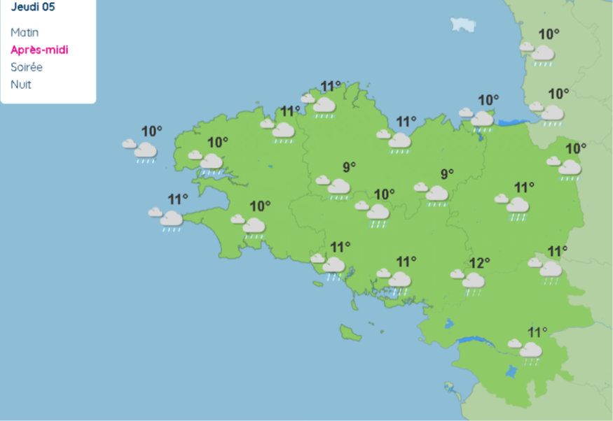 Mercredi 4 février : temps très perturbé avec de la pluie et du vent d'est soutenu. Températures entre 3 et 6° au réveil et l'après-midi on aura entre 10 et 13°.