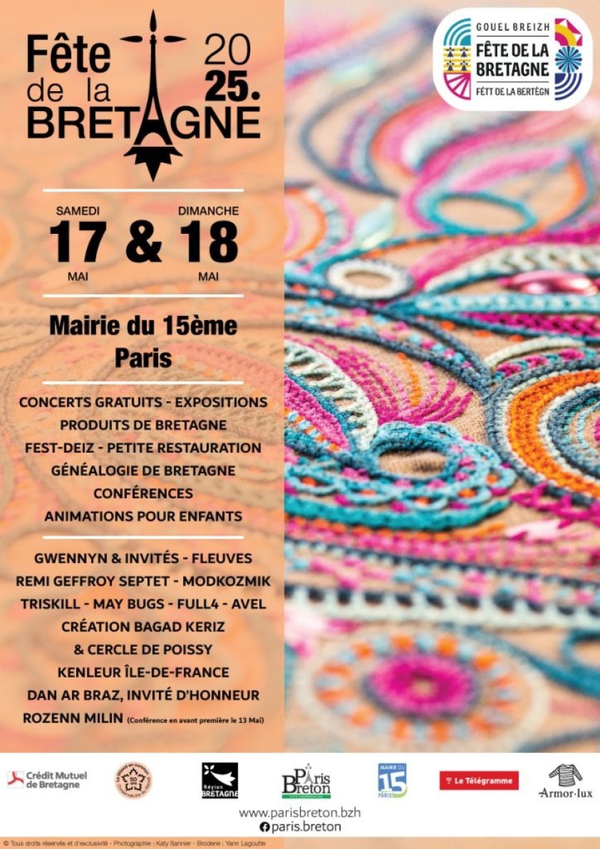 L'association Paris Breton qui a pour mission de faire la promotion de la culture et de l'économie bretonne, ne peut que participer à la Fête de la Bretagne dont c'est la 17ème édition. Rendez-vous est donné sur l'esplanade de la mairie du 15e arrondissement de Paris samedi 17 et dimanche 19 mai avec au programme une exposition sur le renouveau de la broderie, une conférence sur la généalogie, un stand librairie, de la gastronomie et évidemment des concerts. Dan Ar Braz est l'invité d'honneur de l'association Paris Breton et il vient pour dédicacer son livre Chemins bleus. Il vient sans sa guitare a t-il précisé. Pour la partie musicale et pour danser, on peut compter sur Gwennyn, Fleuves, Rémi Geffroy, Triskill, Modkozmic, Full 4, Avel, le Bagad Keriz ou encore le Cercle de Poissy.