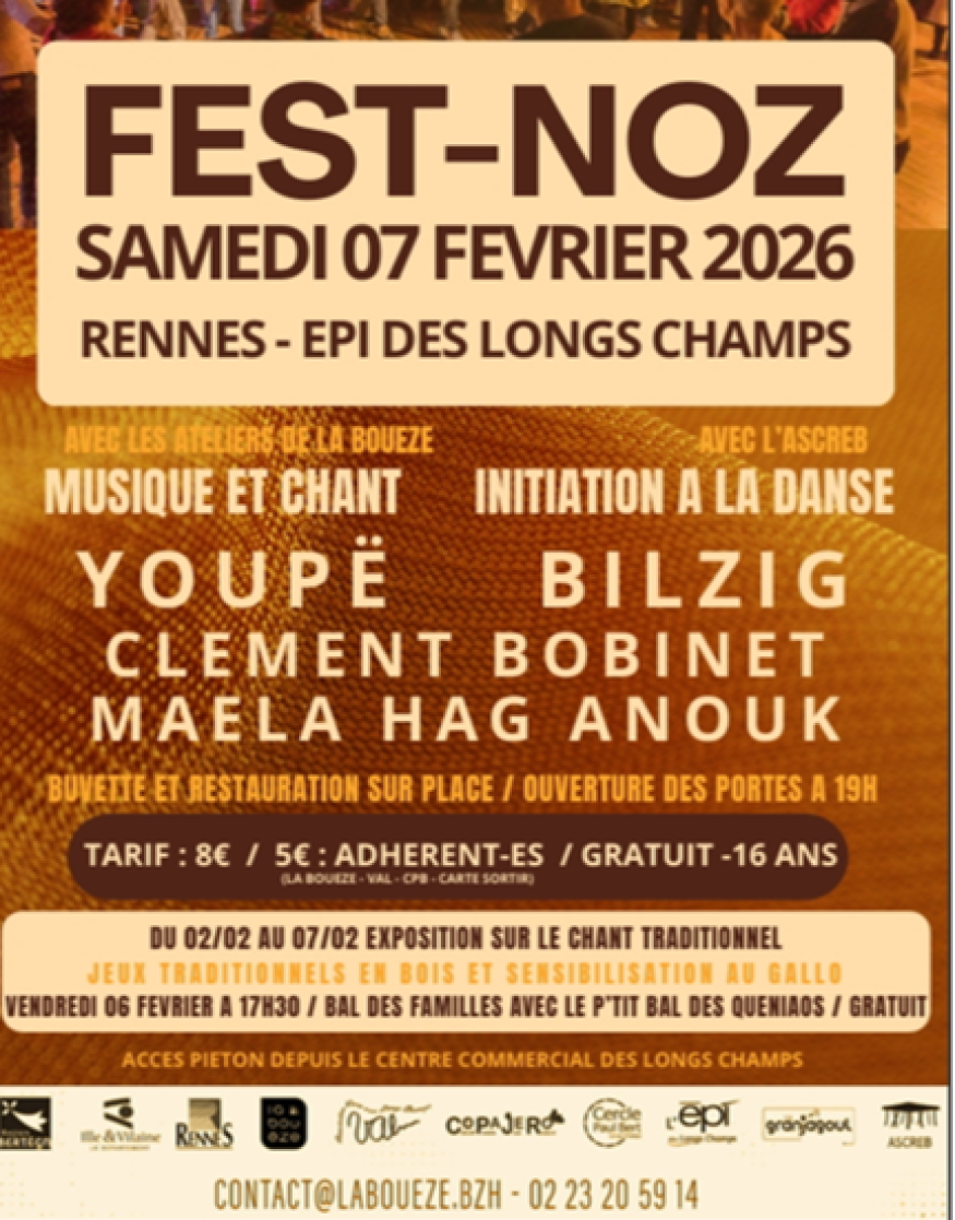 L’association La Bouèze organise en partenariat avec Vivre aux longs-champs et le Cercle Paul Bert, un fest-noz le samedi 7 février 2026. La soirée se déroulera à partir de 19h, à la salle de l’épi des Longs Champs au 66 rue des doyens Albert et Pierre Bouzat à Rennes.