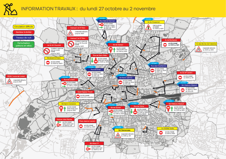 Rue de Lorient : du lundi 27 au vendredi 31 octobre, la circulation sera interdite dans le sens est>ouest entre la rue Louis Guilloux et le pont SNCF, afin de permettre à SNCF Réseau de réaliser des travaux de peinture sur un ouvrage d’art. Une déviation sera mise en place par la rue Louis Guilloux et le boulevard Marbeuf.