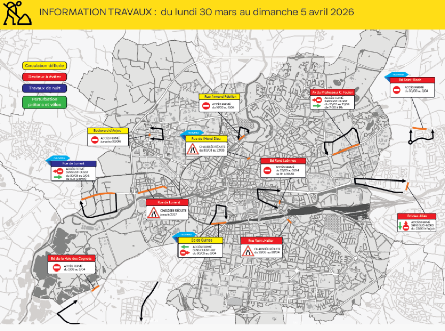 Boulevard de Guines : du lundi 30 mars au vendredi 3 avril, la circulation sera interdite dans le sens ouest>est, entre le boulevard Saint-Conwoïon et le boulevard de la Tour d’Auvergne, afin de permettre une reprise de chaussée suite aux travaux de chauffage urbain par Enersud. Une déviation sera mise en place par le boulevard Saint-Conwoïon, la rue Pierre Abélard et le boulevard de la Tour d’Auvergne.