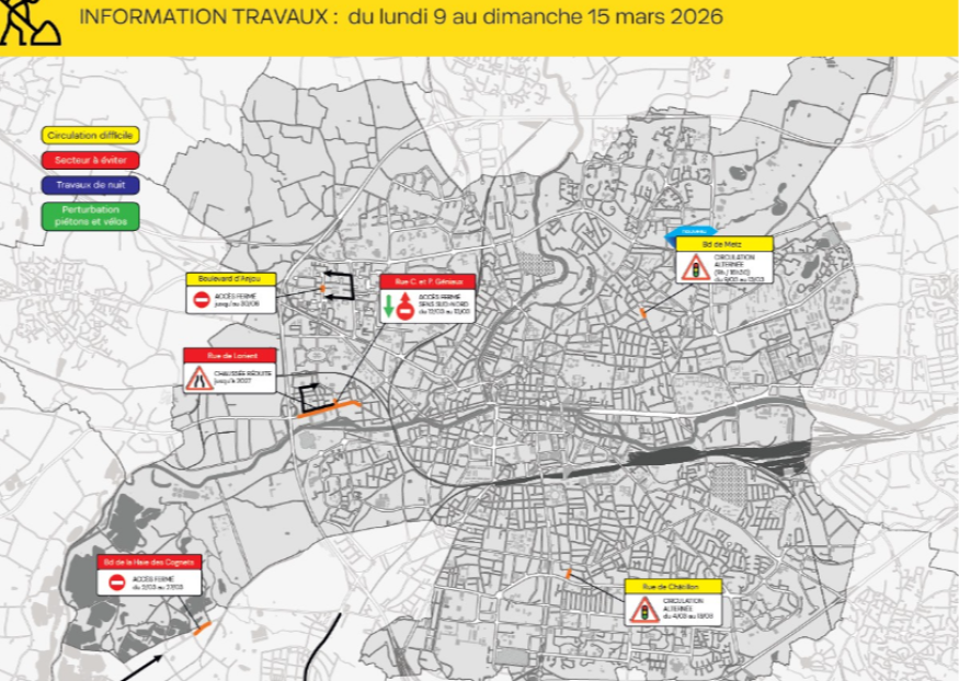 Avenue du Général Georges S. Patton : jusqu’à mars 2026, la circulation est interdite entre l’avenue de Rochester et la rue Franz Heller, dans le cadre de l’aménagement du carrefour Patton/Rochester. Une déviation est mise en place par l’avenue de Rochester, la rue Guy Ropartz et l’avenue des Monts d’Arrée.